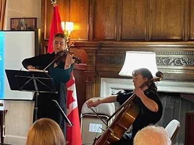 | 映画「シンドラーのリスト」のテーマ曲を披露するエリズ・デュベ氏(バイオリン)とオレリー・デュベ氏(チェロ) |