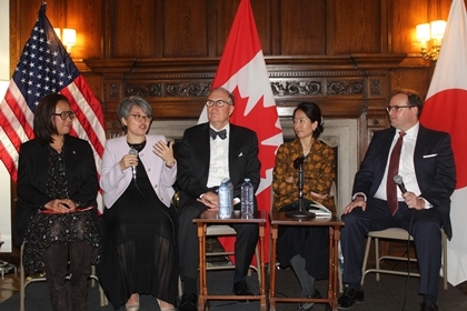 パネルディスカッションには、コリン・ロバートソン・カナダ外交問題研究所(Canadian Global Affairs Institute)副会長、木島里江トロント大学マンク国際問題公共政策研究所助教授、ウィジョン・マギリス・カナダ国立美術館学芸員補佐、山本訓子国際交流基金トロント事務所長が登壇しました。モデレーターは、マシュー・ミラー国際文化会館北米事務所諮問委員会会員が務め、日・加・米の3か国が文化的なつながりをどのように強化していけるか、また、文化外交の実例などについて、専門家による活発で洞察に富んだ意見交換が行われ、聴衆からの質問も受け付けられました。