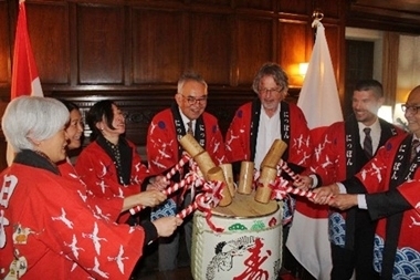 山野内大使による冒頭挨拶では、刻々と変化する昨今の世界情勢に触れつつ、2025年の日加間の特筆すべき出来事を振り返った上で、2026年においても、より重層的な日加両国の友好関係及びパートナーシップを構築する基礎となるのは両国国民同士の交流及び友情であり、本レセプションもそれらを育む良い機会となる旨を強調しました。その後、スタン・クッチャー連邦上院議員及びマット・ミワ・オタワ日系協会会長が来賓挨拶を行ったほか、2026年が幸福で豊かな年となることを祈念し、鏡開きを行いました。また、坂尻朋美・音和太鼓代表が乾杯の辞を述べました。